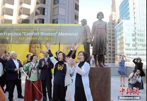 9月22日,在旧金山市圣玛丽广场,慰安妇雕像揭幕仪式隆重举行,这是美国主要大城市第一座慰安妇雕像,雕像以中国、韩国和菲律宾三名年轻女子手拉手的形象为主体,代表当年的慰安妇,旁边还有一名老妇在仰望,代表健在的慰安妇,碑文内容为,“在1931年至1945年间,13个亚太国家的女性成为日军的性奴,此碑见证了成千上万被称作‘慰安妇’的妇女和女孩。”雕像由当地华裔、韩裔为主的民间团体“慰安妇正义同盟”募资并推动落成。
