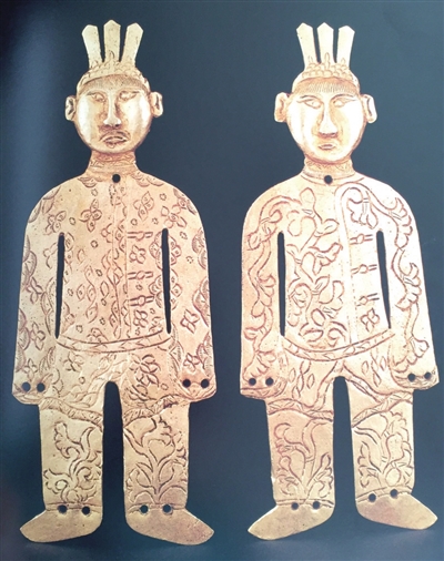二饰件形象为一男一女,均用金版錾刻而成。男、女呈站立式,双手自然下垂,双脚外撇。二人均留有齐眉发,圆眼、阔鼻、头戴三叉式高冠,冠体饰鱼鳞状纹。上身穿直领左衽窄袖衫,下身着裤,足穿高靴,腰系蹀躞带。服饰上錾刻忍冬、松叶、四瓣团花等图案。其中男性嘴微闭,上唇两侧有“八”字形胡须,女性小嘴微张。两饰件在颈部、双手、双脚部位均有穿孔,应为缀钉所用。