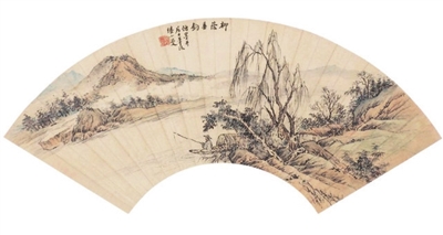 相比别的画作,陆小曼的扇画尤为精致,深受当时名士们的喜爱。在一幅陆小曼于1943年所画的《柳荫垂钓图》中,一只带篷的小船静静地泊在湖上,隐者面对青山悠然垂钓,岸边柳丝垂拂、柔情似水。画面似一幅素雅的绸缎,营造出一种静谧清幽的情趣,意境清远萧疏。用笔轻而松,墨色简淡却无纤细浮薄之感,以淡墨简笔有神地笼罩住整个画面,可谓天真幽淡。画中那种书卷之气,深深地感染着我们,这也正是她的作品个人魅力之所在。