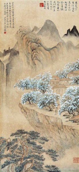 陆小曼致力于研究元代倪云林、明代沈周、清代王鉴等大师的作品,她的画作也形成了文人画的风格,赋色清丽雅致,格调脱俗,润泽秀丽。在她的《梅屋图》上,隐士在深山幽谷中欣赏耀目的白梅,诗意盈满,幽趣盎然。整幅画面古朴幽雅、清新悦目。小曼在画上自题有“余生平爱梅成癖,因其骨高不与群花争艳,其味香而清逸。若能筑屋梅间住,定能一洗胸中积闷之气也。”另有画家孙雪泥题句为:“为觅空香绕屋栽,万花留向故园开。诗人合是陶元亮,每到花时始一来。”妙句添彩,可谓恰合画意。
