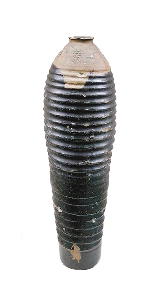 元铭“葡萄酒瓶”黑釉长瓶出土于内蒙古乌兰察布市察右前旗元代集宁路古城遗址,它高43厘米,口径9厘米,底径9.3厘米,器身细长,小口,短颈,长腹,肩上阴刻“葡萄酒瓶”四字,肩以下施黑釉,并饰瓦楞纹。