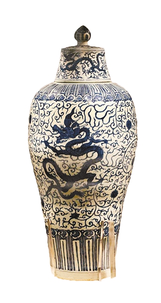 1958年,北京定陵出土瓷器十六件,其中有八件是青花梅瓶,均放置在帝、后棺椁之两侧。它们形状相同,皆小口,细颈,广肩,瘦高腹,平底,有盖。万历帝椁旁的四件通高71-75厘米,白地青花,瓶盖绘双龙、番莲纹,肩部有“大明万历年制”款,瓶身上部和下部绘变形仰覆莲瓣纹,瓶身中部绘二龙、番莲纹。定陵出土的青花梅瓶,作为御用之物,制作得非常精美,修长的身形,素雅的青花,白净的胎釉,相映成辉。其花纹图案简洁,主题突出,线条流畅,疏密恰当。