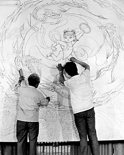 1979年张仃(左)在首都机场壁画《哪吒闹海》绘制现场。资料图片