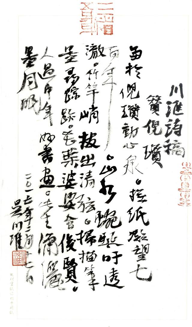 此次展览的展名由文博家陈鹏举题签。年近九旬的书法家、诗人谢云题贺:“赏雨茅屋,君其芬芳,书画自语,挥洒绵长。”展览开幕式上,吴川淮向中华慈善总会“明天会更好”慈善爱心基金捐赠了自己的作品。在当天举行的作品研讨会上,与会专家学者充分肯定了吴川淮在书画创作上的钻研与探索精神。大家认为,吴川淮每日一记、每日一画,不仅记录了时代,展示了艺术与生活的融合,而且体现出当代文人的书画情结与勤奋好学。