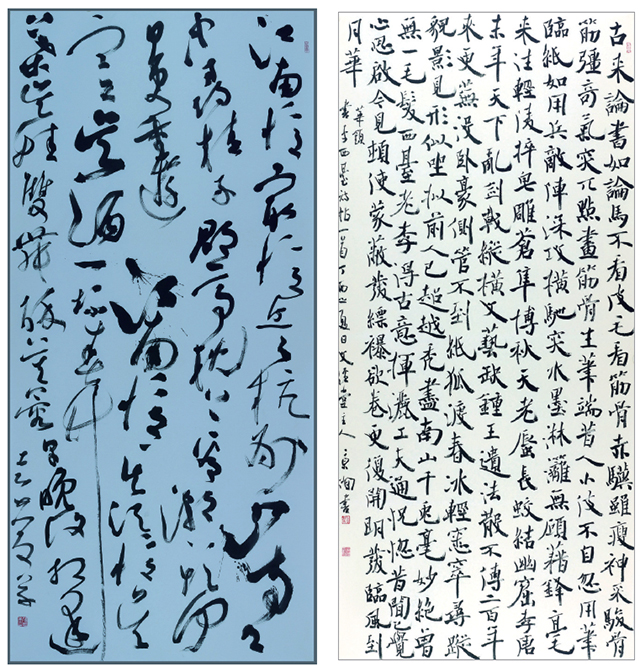 自2011年起,“沈门七子书法展”已分别在滕州、北京、南京、济南、成都、张掖等地举办了六届,此次展览是第七届。七年来,“沈门七子”在沈鹏“弘扬原创、尊重个性、书内书外、艺道并进”16字方针指引下,严格遵从其教学理念,深挖传统,植根经典,相互切磋,取长补短,取得了显著成绩。他们的作品传统功力深厚,艺术感染力强,既有传统笔墨语言,又有鲜明的现代气息。其笔法运用的熟练度、线条墨色的表现力、章法构图的掌控力,使作品具有强烈的画面感和震撼力。同时,他们继承古人又异于古人,形成了各自富有特色的面貌和艺术语言:王厚祥的大草纵横驰骋,挥洒自由,线质苍茫,千姿百态;刘京闻笔意线质古朴厚重,欹正变化,疏密相间;龙开胜五种书体均有很好表现,楷行尤佳,结字凝练平和,不激不励,风规自远;周剑初五体兼习,大字雄浑苍茫,小字险峻耐品,古拙潇洒;李明大字楷书线质老到、结字开张,小楷沉着痛快、疏密得当,行书悠然自得;张志庆的大字行草线质苍茫老辣、章法疏密相间,小字行草温文尔雅;方建光深得“二王”意韵,用笔自然,变化丰富,又参以米意,结字奇崛,耐人寻味。他们通过多次展览,与各地书法家形成了良好互动,不仅广受关注,并收获了许多宝贵的经验和建议,使其在艺术上不断取得进步。