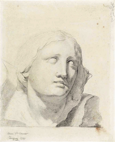 1780年,安格尔出生于法国南部的蒙托邦。从六岁开始,他就随装饰雕刻家父亲学习绘画和小提琴。九岁时,安格尔开始接受正规的石膏素描训练,这幅作品就是现存他人生中第一幅画。这幅画描绘的是尼俄柏的石膏头像。尼俄柏是希腊神话中底比斯国王安菲翁的妻子,她生了七个儿子和七个女儿,她因此骄傲,阻止底比斯妇女向勒托献祭,被激怒的勒托叫阿波罗与阿尔忒弥斯把她的七个儿子和七个女儿都杀死了,安菲翁也自刎而死。伤心的尼俄柏化为石像,永远流着悲伤的眼泪。