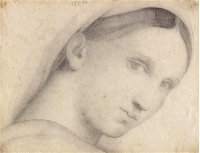 安格尔非常崇拜意大利文艺复兴艺术家拉斐尔,他曾感叹,要是早出生300年就好了,那样他就可以成为拉斐尔的弟子了。安格尔大半生都在临摹以及让自己的学生临摹拉斐尔。这幅《椅子上的圣母》草稿临摹自拉斐尔创作于1514年的《椅中圣母》。拉斐尔原作中展现了圣母、圣婴和约翰三个形象,但是安格尔在这幅草稿中只临摹了圣母头像。