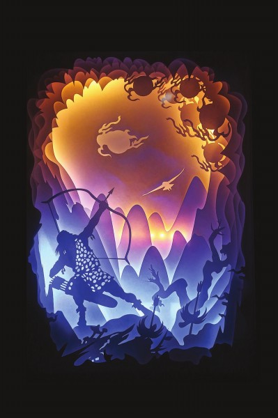 李雯琪纸雕灯箱《后羿射日》。纸与多媒体光影复合成神秘而又梦幻的创世神话故事。(展方供图)