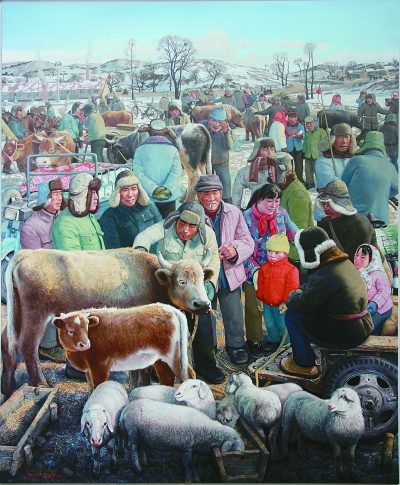 “历史之思”板块集中了描绘历史事件、典故,表现文明史、近代史、革命史等方面的造型艺术作品,凝聚了四川美术学院建立以来的历史意识、历史情结和优良的革命文化传统,《秋收起义》《铁军东进》《日出东方》《彝海结盟》《红日》《云岭的怀念》等作品让人印象深刻,其中一些作品在写实历史人物、事件的同时,融入了美术家对于构图或是色调的巧思,力求营造出历史的厚重感和年代感。“现实之境”板块呈现了扎根当代生活,反映当下现实,作出时代思考的造型艺术作品,如描绘奥运瞬间的作品《烈日下·北京2008》、展现抗震救灾场面的作品《万众一心》、反映城乡变迁的作品《野草滩的牛羊集市》等,其中,油画《野草滩的牛羊集市》集风景、人物、动物、静物等自然界的物象于一画,以宏大的叙事场面对中国北方农村的生活习俗进行诗意化表达,充满浓郁的生活气息。作为第三板块的“语言之象”为观者展示了深入体现造型艺术及造型语言、语汇拓展的创作,《大舞台》中夸张的人物造型强调了画面的几何构成和诙谐氛围,《记忆与梦想》用新颖的画面布局描绘航天成就,打破了空间与时间的界限,营造出富有当代意味的画面图式,《雪夜山影》则充分利用材质的特殊质感,演绎出磅礴与精微间的平衡之美。