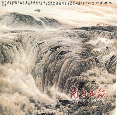 展开曾嵘的黄河画作,首先感叹他的立意和画面的取舍。在中国画批评中常说的最多的3个词是“气韵”“笔墨”“写意”。张大千认为写是用笔,意是造境;潘天寿认为笔表现气,墨表达韵;徐复观认为气为阳刚之美,韵为阴柔之美;看曾嵘的黄河画作,强烈感受传统画作中“笔墨”为主线:笔表达气、阳刚,主体是写;墨表达韵、造境、抒情,呈现阴柔之美。正是极强的笔墨表现,从而形成了瓜熟蒂落式的个性笔墨图式。笔墨是中国画特定的形式语言,对线力和墨韵的技法运用,基本上可以体现一个画家审美追求和价值取向。曾嵘以岭南画派的传统技法为基调,能动地吸取当代成功画家的各种经验,形成了具有鲜明个性化的艺术风格。黄河画作中,他的手法表现正具典型的现代性——既有对西方画法表现手法的借鉴,也有水墨化的强烈倾向,还有北方画派的冷峻、干裂、粗犷的造境。在色彩的运用上,他在传统色彩的基调上大胆地糅合了现代绘画的冷暖变化,使画面显得明快、新颖,使色彩和墨韵达到相得益彰的效果。