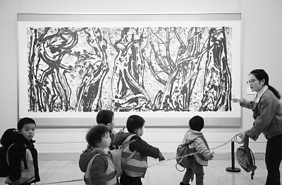 2017年11月17日,一名幼儿园老师带着小朋友们在中国美术馆参观展出的吴冠中作品《根扎南国》。当日,“美在新时代——庆祝‘十九大’胜利召开中国美术馆典藏精品特展”在这里向公众开放。新华社记者 鲁鹏摄