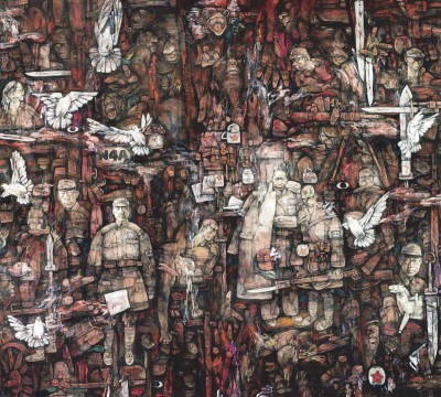 李伯安 《走出巴颜喀拉》 全卷高1.88米、长121.5米、具体描绘了两百多个神态各异的藏族人民形象。全画共分10部分,这一部分 《歇息》 以浓重而坚实的墨色,干湿并用,描绘了几组正在歇息的人物形象。李伯安没有描绘强烈的动势,但饱满的人物造型使整个画面中涌动着撼人的力量。远景中以大笔挥就的带有抽象意味的笔线,使这几组群像之间的空间关系被连接起来,而藏袍在整个画面中连贯不断,使之有巴颜喀拉山连绵不绝的感觉。李伯安以惊人的毅力创作 《走出巴颜喀拉》 长卷,历时十余年,直至去世时尚未彻底完成,最终倒在长卷前。此画一经展出,就震动了美术界。这一史诗般的巨作将1990年代的写实水墨人物画推向了一个新的高度。