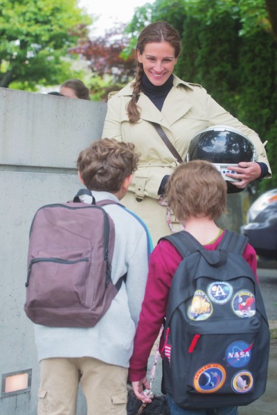 天生面部畸形的奥吉(右),习惯了用头盔保护自己。图为电影《奇迹男孩》剧照,茱莉亚·罗伯茨饰演奥吉的母亲