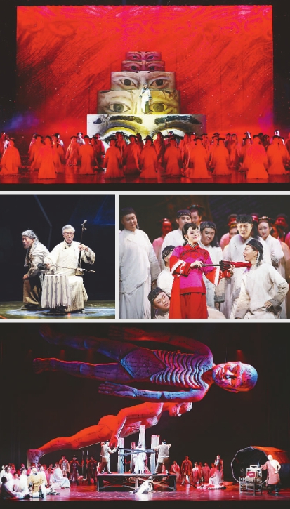 最后,舞台美术语言也是传统文化的符号性折射。该剧主创团队通过被放大的肢体在舞台上的大胆运用(如木刻人脸、绣花鞋小脚、布满经络的人体标本、重叠的带有惊恐眼神的头像等等) ,夸张地暗示了人性的扭曲以及在无常的命运和权势面前,普通人的卑微与渺小。可以说,舞台美术准确地诠释了小说精神,是原小说局部夸张手法的映射,与歌剧音乐相得益彰。