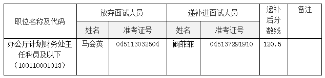 因部分考生自愿放弃面试资格,根据公务员招考有关规定,拟在公共科目笔试合格的考生中,按照笔试成绩从高到低的顺序递补面试人员。具体情况如下: