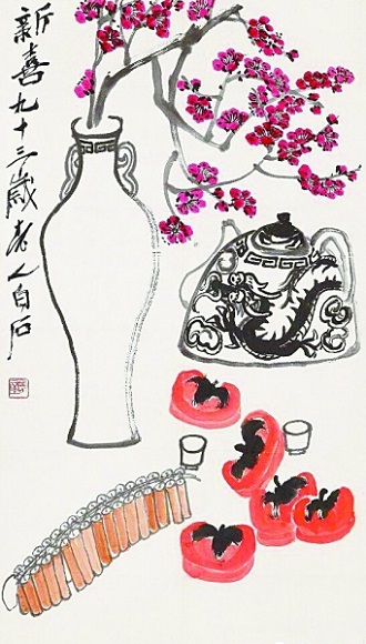 在齐白石笔下,传统的“岁朝图”便更多了些世俗烟火之气。众所周知,齐白石有一套本事,便是为“万虫写照,百鸟传神”,许多在前人看来不入画的东西在他的作品里都有表现。其《岁朝图》也是如此,牡丹、水仙、柿子这些吉祥花果在他的画里依然常见,而前人少画的灯笼、爆竹、茶壶等物什也成了他画里的主角。且看齐白石作于93岁的《岁朝图》,瓶中几枝红梅娇艳可人,再配上几颗红柿子、一串红爆竹、一只龙纹壶、两盏素茶杯,既有吉祥如意之愿,又有日常生活之趣,寻常百姓家的年味儿跃然纸上。画题“新喜 九十三岁老人白石”,足见画家当时的喜悦心境。是年,北京文艺界专门为齐白石召开祝寿大会,周恩来总理亲自出席宴会,对这位画坛耆宿给予了极高的礼遇。可见,齐白石此幅《岁朝图》不但接地气、有年味儿,更寄托了古木新枝、老当益壮的美好愿景。