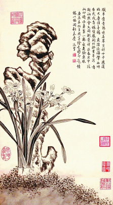 明清时期,“岁朝清供图”也成为文人钟爱的题材,明代的陈洪绶,清初的八大山人,扬州八怪中的李鳝,清末海派名家赵之谦、任伯年、吴昌硕等都有此类作品传世。对于这一现象,美学家陈健毛讲的最为透彻:“岁朝图”的流行可以看作文人画世俗化的缩影,其中很多作品虽表现文人擅长的梅兰竹菊,但其意义往往脱离了传统的品格气节象征,而被赋予平安如意、长寿吉祥等寓意,以迎合市场需求。吴昌硕作于83岁的一幅《岁朝清供图》,所画牡丹、水仙、石头皆为岁朝图中常见之物,然其以书入画,以写代工,牡丹的茎干、石头的轮廓皆显示出其老到的书法功底。至于设色,学的乃是清嘉道年间花卉名家张孟皋,牡丹艳而不俗,水仙雅而不孤。虽然只有两种花卉,但整幅画构图繁密,生机勃勃,与宫廷岁朝图的富贵细腻又大不一样。