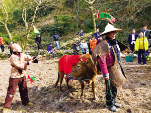 2月4日,九华立春祭在浙江衢州举行。鞭春牛是九华立春祭一个重头戏,是对农耕文化的再现。图为儿童扮演的牧童,唱着《鞭春喝彩歌谣》,鞭打春牛耕作。 资料图片