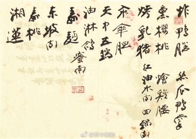 纽约佳士得今日将拍卖:张大千手书菜单 最爱蘑菇青笋白菜