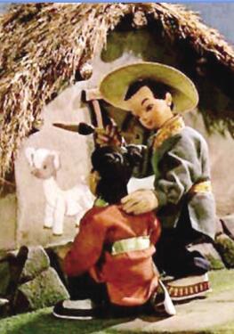 其次,原著中写到统冶阶级夺神笔时,先是财主,后为皇帝抢夺,其意固然在于使得矛盾冲突不断激化,但也不免有故事情节的某些重复。洪汛涛对此作了删除与改动,把财主与皇帝的暴虐行为集中在“大官”一人身上,这样并不削弱原著的斗争激烈程度,反而更加深了观众对统治者的印象。还有把原来抢宝遭惩的情节由两次压缩为一次,既精简了篇幅,又显得简洁明了。