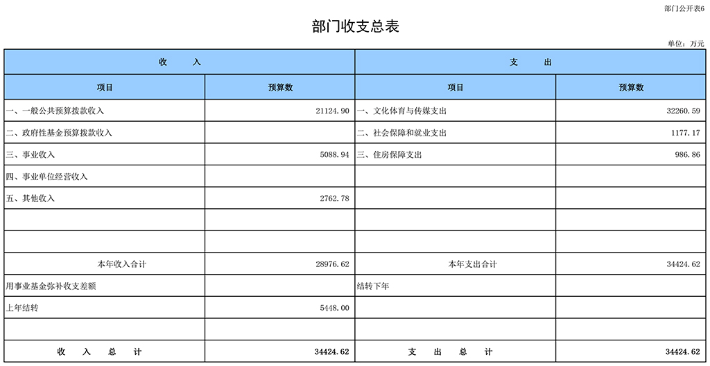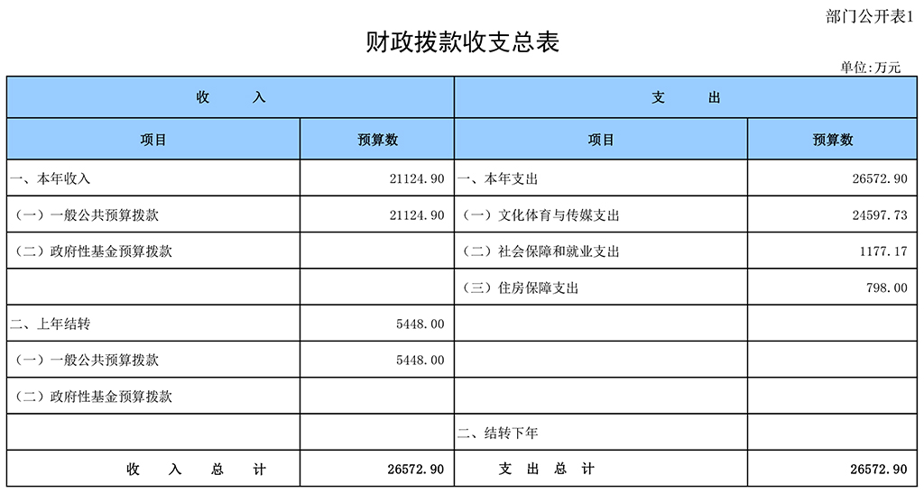 文化体育与传媒支出(类)支出19227.73万元,占比91.02%;社会保障和就业支出(类)支出1177.17万元,占比5.57%;住房保障支出(类)支出720万元,占比3.41%。