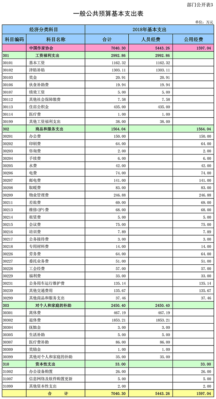 中国作家协会2018 年一般公共预算基本支出 7040.30万元,其中: