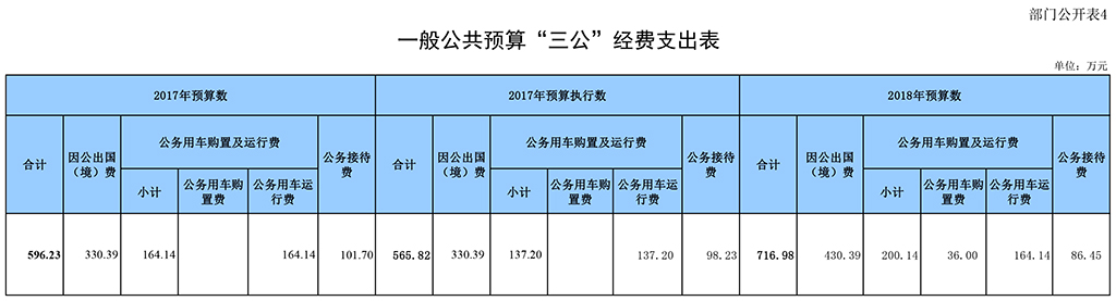 2018年“三公”经费预算数为716.98万元,其中:因公出国(境)费430.39万元,用于开展国际文学交流,推进中华文化走出去;公务用车购置及运行费200.14万元;公务接待费86.45万元,主要用于接待国外来访作家。2018年“三公”经费预算比2017年增加120.75万元,主要原因:一是因公出国任务增加;二是下属单位2018年增加购置两辆公务用车;三是进一步压减公务接待费支出。