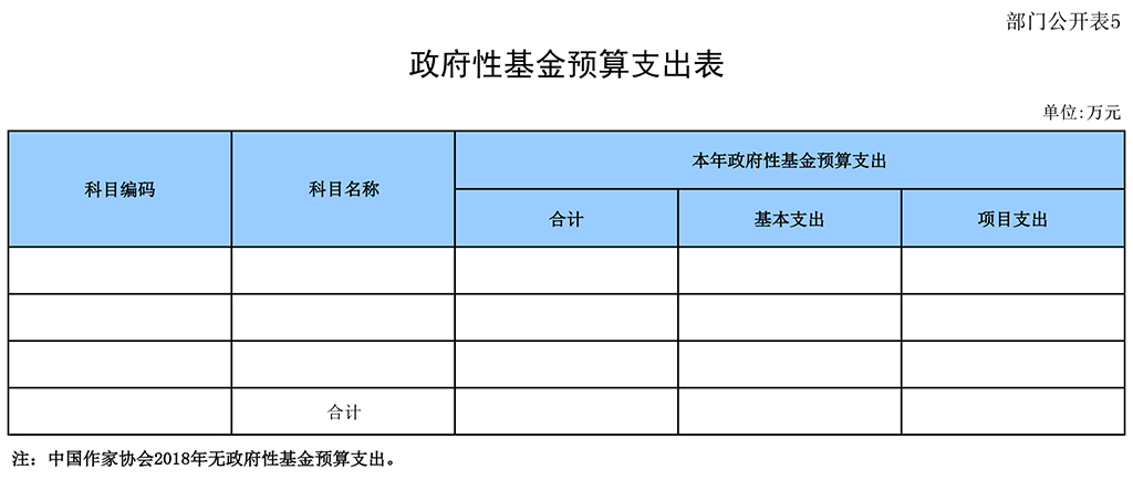 中国作家协会2018年财政拨款收支总预算26572.90万元。收入全部为一般公共预算拨款,无政府性基金预算拨款,包括:一般公共预算拨款21124.90万元,上年结转 5448万元。支出包括:文化体育与传媒支出24597.73万元,社会保障和就业支出1177.17万元,住房保障支出798万元。