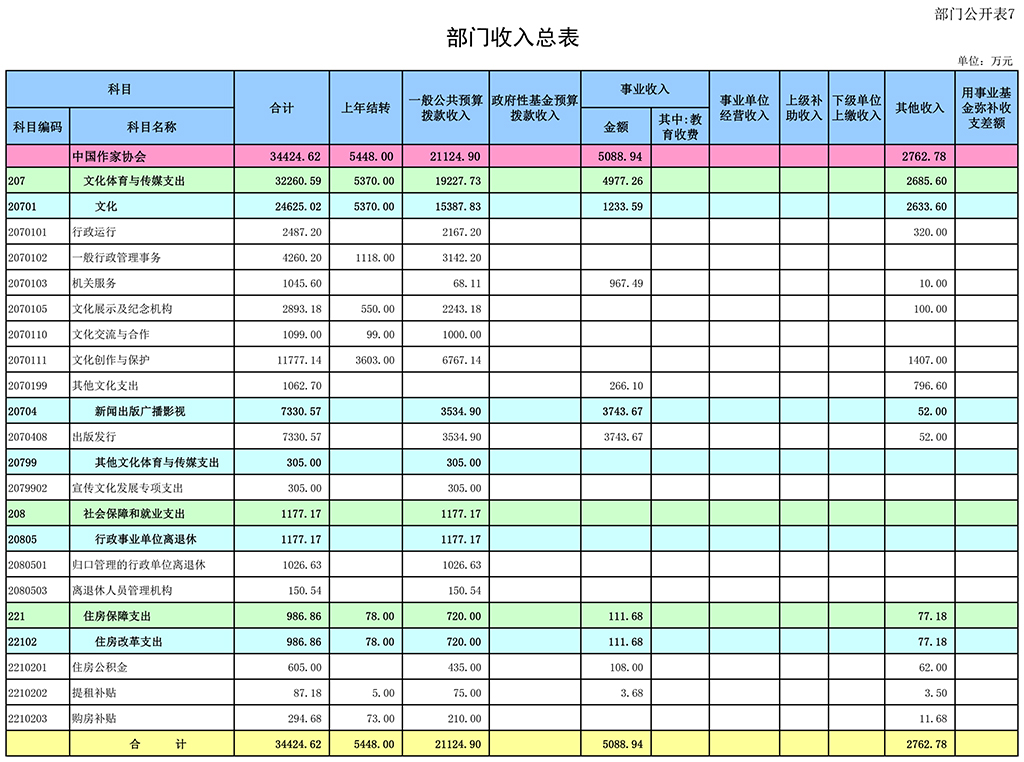 (二)事业单位的全部收入和支出。事业单位包括鲁迅文学院、中国现代文学馆、中国作家协会创作研究部、188bet金宝搏备用网址本级、《文艺报》社、《诗刊》社、《人民文学》杂志社、《民族文学》杂志社、《中国作家》杂志社、中国作家协会机关服务中心、中国作家协会作家活动中心等11家事业单位。