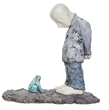 中国传统文化在人与物的关系上强调“合一” ,强调神与物游,体味自然之神妙。在该展的主题上,雕塑作品大多围绕人与自然生态的和谐、人与社会的和谐等展开, 《人与蛙》 《破风》《再生》 《彩虹》 《异域》 《倒影》 《中国风景》 《树》《开合》 《自由之外》等皆是如此。由王少军创作的《人与蛙》以人与蛙相互对立、互相凝视构成一组对比图,作品中人的眼神好奇、迷茫,蛙的眼神坚定、无畏,在二者的互相“审视”中,仿佛说出了人与动物的相处焦虑,也警告着我们应有的对自然的尊重,而将其放置于沙滩前的草地上,似乎也在寓意着回归自然;武定宇创作的《溪山·闻声》以不锈钢为固体线条制作成一幅立体镂空的“溪山图” ,厚重的框架好似一幅相框,而蜿蜒的线条绘出了山与溪的形状,四周的树木丛林透过空出的部分进入画面,仿佛该作品与周围的树林合为一体,立刻有了生机。无论是作品本身对人与自然关系的哲思,还是现实中这些作品与周围环境的互动,都是将“合一”的价值用雕塑呈现出来。