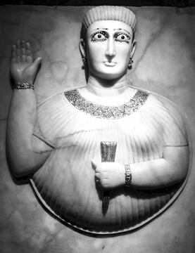 展厅入口处一件挂在墙上的女人半身浮雕石像,将记者带入世界文明的语境中。这件浮雕是个石碑,来自阿拉伯南部,展现了一名佩戴镶镀金珠宝的妇女形象。女人仿佛是从长方形背板上的圆洞中钻出来的。她抬起右手,掌心向外,左手握着貌似用金子做的一把小麦,专家说这是生育的象征。女人穿着短袖百褶上衣,佩戴精致的金项链。她的眼睛特别醒目,不仅用石头镶嵌作眼珠,还在其上嵌了黑色的石头作为瞳孔,睫毛用金属制成,眉毛也残留着镶嵌物。专家说,这可能是一件表现妇女祭司向太阳女神求情场景的陪葬石碑。这种形象的石碑是阿拉伯南部经典的作品风格,伦敦大英博物馆有一件与此极为相似的公元一世纪作品。