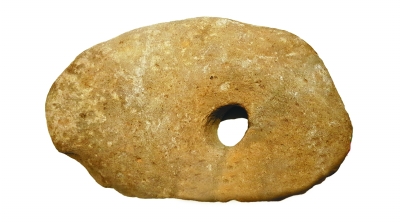 2015年7月7日,张福有与池南区区委书记曹树清、科员于建一起,在区委所在地抚松县漫江镇漫江村进行田野调查。于建看到一块带孔的石头,拿给张福有看。“我接过来一看,马上看出这个孔肯定是人工磨出来的。孔的周边约有1厘米向下磨了,凹了下去,而且两面都有,这是典型的人为痕迹。可惜少了一个角,这个孔应该能环上,缺的部分非常重要,必须马上找到!”张福有对记者说,“于是,我们马上开始寻找丢失的另一小半。”