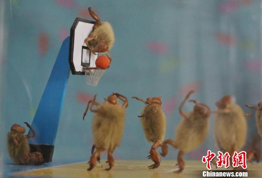 济南市毛猴非遗传承人杨凤岩塑造毛猴“七十二变”的形态,图为杨凤岩创作的“毛猴打篮球”。 赵晓 摄