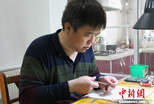 图为杨凤岩向记者展示毛猴制作过程。 赵晓 摄