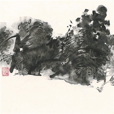 吕品田的水墨山水布局用心而不刻意,笔墨有成法而不拘泥,最能体现“乘物游心”的初衷。他以山川草木入画,中锋勾勒树木草叶,侧锋排扫山石峰峦,辅以温润清透的泼墨,任水墨在纸上自然洇渗,形成笔形墨迹浑然交融的天成般的机趣与韵致。在他的画上,墨迹与水痕相互映衬,燥润适宜,刚柔相济。包括用以表现山石的自谓“斫木皴”,那颇具个性的笔法,不取巧、不藻饰,坦荡大方,显示了不同于传统山水画笔墨程式的独特性。