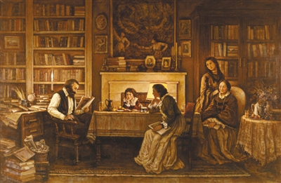 孙景波的《革命的一家人》描绘了一个安详宁静的夜晚,烛光下、壁炉前,马克思的家庭诗歌朗诵会正在进行。这是一个享受莎士比亚诗意的美好夜晚:二女儿劳拉依偎在母亲燕妮身旁,大女儿小燕妮坐在桌前出神地凝视着父亲的表情,不满八岁的小女儿艾琳娜,看着爸爸动情的样子,眼神里充满喜悦和好奇。此刻,马克思自己也沉浸在诗意之中,他的手指伴随着朗读的节奏,下意识地在坐椅的扶手上敲打着节拍。马克思的家庭,是一个令人敬慕的、伟大的革命家庭。他的妻子燕妮,不仅是他生活、生命中亲密的终身伴侣,而且是他思想的、革命事业的坚定不移的同志和战友。燕妮和马克思的三个女儿,在他的影响下,也都先后成为马克思思想的继承人和无产阶级革命事业的杰出战士。