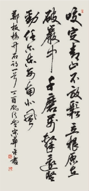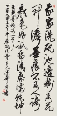 宋华平行草书蕴涵着无限的生机和激情。行草书线条若没有抒情的成分,其外形将了无生命气息,徒有空洞的技巧表现及看似完美的形态特征。笔墨的形状、大小、方向、位置、空间、重心占据空间的方式等都直接影响到作品的视觉美感。宋华平的行草书有意强化点画之间笔势的往来控制,表现线性的丰富美感,比如刚与柔、重与轻、快与慢、徐与疾、紧与松等,用相反相成的用笔表现形式,凸显线条节奏感,在墨色变化、抒情性上寻找表达与突破,在变化的点画之中构建新天地。为了使整幅作品显得灵动多变,其作品采取斜势,这些取斜势的字,与取正势的字相互依托,在整幅作品的章法上起到了恰到好处的协调作用,化解了作品的板滞之气,达到线性的灵动与抒情唯美表达。