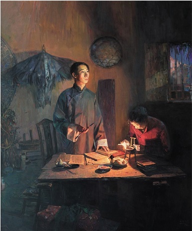 来自中央美院的张峻明创作的作品为油画《陈望道翻译〈共产党宣言〉》,是用油画的形式,去表现一个发生在上世纪20年代的中国场景片段。“过年都没停下来,一直在画。整个创作过程中,信仰之火一直在我心中燃烧,一直激励着我。”张峻明对记者说。今年1月,选题确定后,张峻明随即离开北京,赶赴浙江义乌收集素材。陈望道故居位于义乌市城西街道分水塘村,是一幢建于清宣统年间的庭院建筑,张峻明在故居里漫步构思,创作构图在脑海中渐渐浮现。“看着今天这里的陈设,见到越来越多的人受信仰的感召,千里迢迢来到这里,重温入党誓词,仿佛是对近一个世纪前那位伏案疾书,追求共产主义青年的遥远回应。故居右角不远处是陈家的柴房。从柴房到正厅,我竭尽所能将捕捉到的一切转化成视觉语言。”