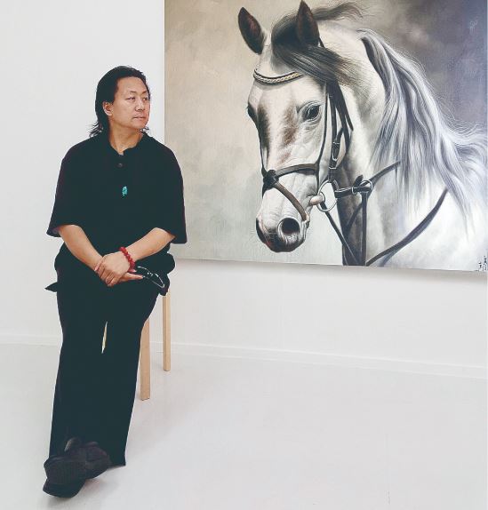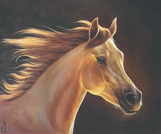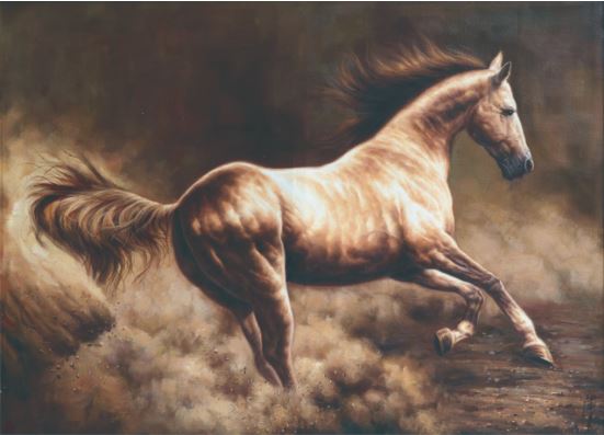 离开草原后,我投入到文学创作中,从《长江之歌》、中国共青团团歌《光荣啊,中国共青团》到中国武警主题歌《忠诚卫士之歌》,戎马一生的我阴差阳错地成为一名军旅作家。岁月流逝,蛰伏于心中的骏马情结却依然浓烈。十多年前,我结识了青年画家黄广亮,他热情、爽朗、谦逊的个性吸引了我,而他笔下的马,更令我赞叹不已。他画的马惟妙惟肖,无论奔马、立马、马群都赋予了充沛的生命力。在广亮的笔下,一匹匹骏马奋鬃扬蹄,挟风而进,在广袤的土地上飞奔。有的腾空起飞,有的蹄下生烟,有的回首顾盼,有的长嘶呐喊,仿佛都要破纸而出。马的眼睛闪闪发亮,无论你从哪个角度看,它的目光都好像在追随着你,似有无限的眷恋之情;那挺拔的骨架像跃动的山峰,长长的鬃毛似缎带凌风狂舞,有力的脖子若龙颈屈伸,宽阔的胸膛肌肉抖动;凸起的血管青筋,你似乎能触摸到那种血脉偾张的力量;钢打铁铸般的四肢腾挪劲健猎猎生风,仿佛一旦踏上大地,就会擂响奋进的战鼓;张大的鼻孔有若喷筒,好像吹口气,这些马就能打着响鼻从画布上跑下来……广亮画的马,刚劲矫健、阳刚大气激荡其中,挥洒着北方人豪爽豁达、抱志不屈的天性,溶铸成了自由奔放、宏伟壮阔、纵横豪迈的艺术风貌和大美境界。