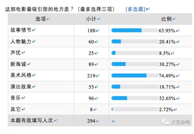 接受调研的人群的审美倾向可以显示这部电影有趣的一个层面:它以“普通电影”的身份进入大陆电影消费视野的,并非像此前的宫崎骏电影那样,具有定向吸引观众的特色。如图——