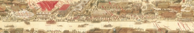 八年前画院17位青年画家为上海世博会集体创作的长卷 《万国风采耀浦江》,出现在此次展览。这幅画高0.47米、宽21米,采用的是风俗画的传统形式,描绘了浦江两岸世博园区的万国建筑与各色游人,创作历时两个月完成,刻画精细。