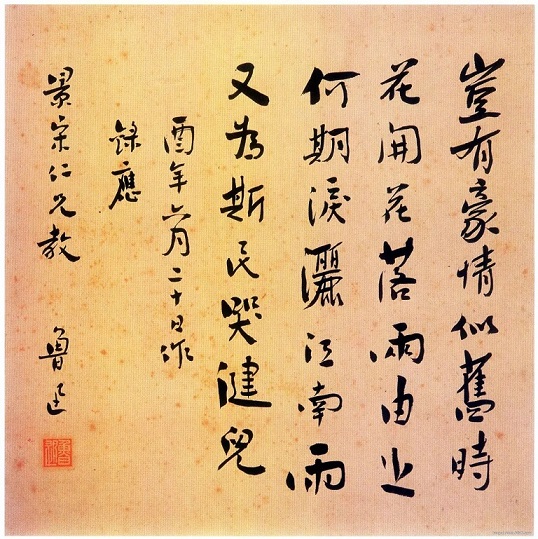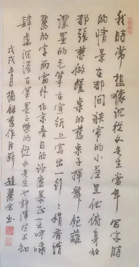 不过,看沈从文的这幅字,更多时候使我感受到的,是中国文字的优雅和奇妙。我常常想象沈从文当年写这幅字时的情景,在那间狭窄的小屋里,他俯身于那张兼作餐桌的旧桌子,挥舞饱蘸浓墨的毛笔,在宣纸上写出一行行狷秀清丽的字。而窗外,北京春日的沙尘暴正在呼啸肆虐,沉浸在笔墨之乐中的沈先生大概是浑然不知的吧。