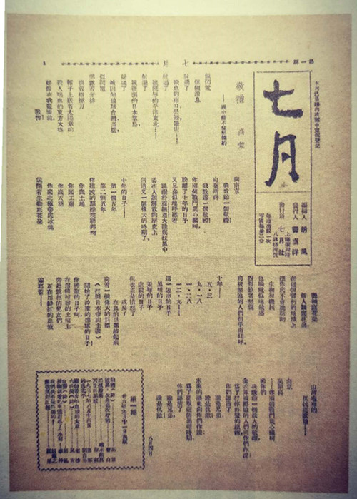 《七月》1937年9月11日创刊,周刊。胡风编辑。七月社发行。出版地上海。出至第3期停1刊。同年10月16日在武汉复刊刊,改为半月刊,期号另起,上海杂志公司发行。次年再度停刊。1939年7月又在重庆复刊,改为月刊,华中图书公司发行。1941年9月终刊。前后共出35期。