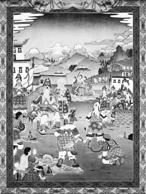 珠牡懂得格萨尔此时的心情,却不忍心丢下孩子,肝肠欲断。她看见大王已经走在前面,看了一眼熟睡的儿子,亲了亲孩子的脸,把他放在库房里,一步三回头地出了库房。