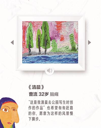 记者注意到,在“一元购画”公益活动里,有两幅32岁脑瘫患者曹流的作品,一篇是《无常》,画的是一朵粉红色的画,另一幅《清晨》是他清晨在公园的写生。