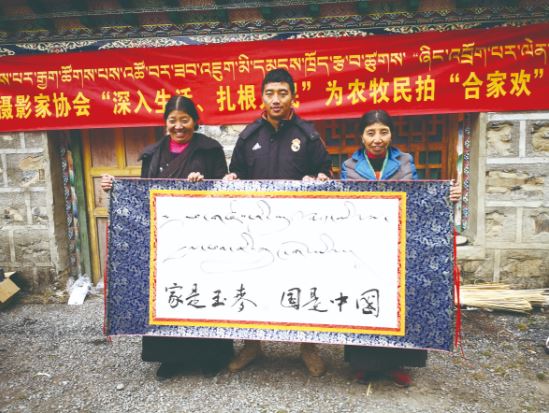我们采风团的艺术家们这次来是有任务的:摄影家现场给村民们拍摄打印全家福,书法家给村民们写“福”字和对联。村民们听说了,都热情地聚拢过来,彩色打印机前一点点被推出的照片,时时引起阵阵欢笑。这时却发现央宗不在,说是一早就到山上赶牦牛去了。姐姐卓嘎特别请书法家写了一幅总书记回信上“家是玉麦、国是中国”八个字的藏汉文作品。央宗回来看到也提出想要一幅,却已经没有裱好的空白宣纸了。我们答应央宗,回到拉萨就给她写完寄过来——文艺家们也不想在这个充盈着幸福氛围的地方留下任何遗憾。