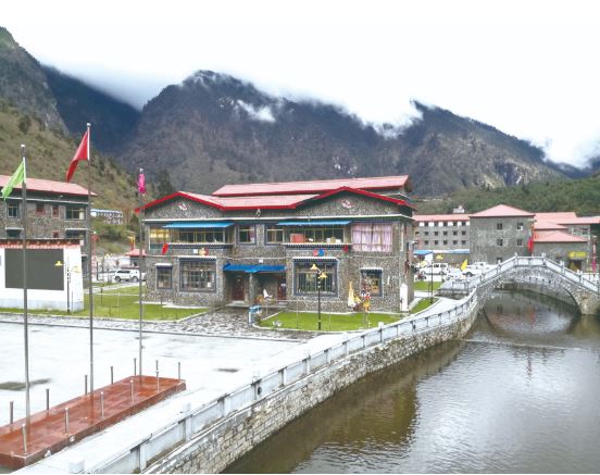这里完全不像边境乡镇的样子!这是最初冲击我的观感。一条干净的高标准水泥路沿着河谷直插下游,一幢幢风格统一的门巴族特色小楼齐布在路边,每一幢楼上都装饰着一个藏族传统的吉祥八宝图案。楼和楼都是相似的布局,一层是农家乐的餐馆布局,二层是住宿区。据说,旅游已经成了这个边境乡镇的主要收入来源之一,而我们来之前的五一假期,这里的房间供不应求。