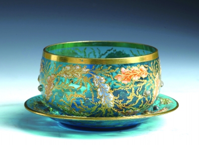 展品中,“透明黄色镀金刻面玻璃画珐琅花卉纹瓶”以华丽的镀金装饰、绚丽繁复的釉彩绘画和车刻工艺阐释了19世纪波西米亚玻璃的精髓;产于20世纪早期的“白套蓝镀金玻璃画珐琅花卉纹瓶”,厚重的釉彩加之镀金工艺使该玻璃器物的表面产生立体浮雕般的效果;“透明套紫车刻镀金玻璃高脚杯”,在透明玻璃表面套色并进行车刻后,再装饰镀金和描金图案,体现了欧洲玻璃富丽华贵的风格。
