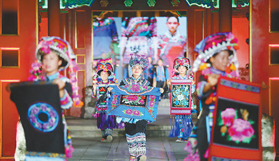 近日,模特在北京恭王府博物馆举办的“云想彝裳”非遗服饰秀上展示服装。在2018年文化和自然遗产日到来之际,由恭王府博物馆牵头,联合中国纺织工业联合会、北京服装学院、中央民族大学民族服饰研究所等举办11场以中国非物质文化遗产为主题的服饰秀展演、“非遗进景区”群众体验性服饰秀等,将多项国家级非遗技艺项目与现代服饰设计时尚融合,将古老的非遗之美与当下结合。