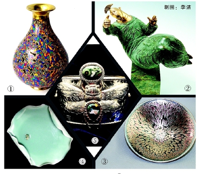 亮相第八届国际传统艺术邀请展的作品:①铜雕技艺代表性传承人朱炳仁作品。②乌克兰国宝级艺术家奥列格·平丘克作品。③建盏烧制技艺新生代工艺师饶飞雄作品。④龙泉青瓷烧制技艺传承人李震作品。⑤上海工艺美术学院青年教师谢白设计的首饰。(均上海艺术品博物馆供图)